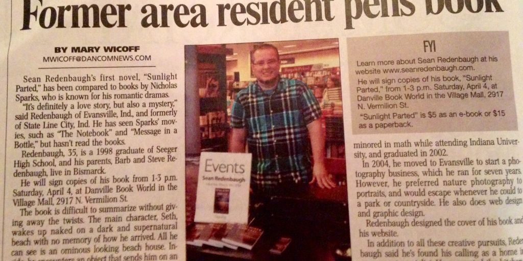 Apr12015WritingI got some major ink in the Danville Commercial News on Sunday. I didn’t expect a full page story in color! Category: WritingBy seanredenbaughApril 1, 2015 Author: seanredenbaugh Post navigationPreviousPrevious post:2nd Edition on the Way!NextNext post:Ordered Some Business CardsRelated postsBlackmill ProgressDecember 15, 2017And so it begins…December 9, 2017Hot Off The PressJuly 20, 2017Evansville Book Signing Was a Success!April 25, 2017Book now for sale here!March 22, 2017First CaseMarch 20, 2017