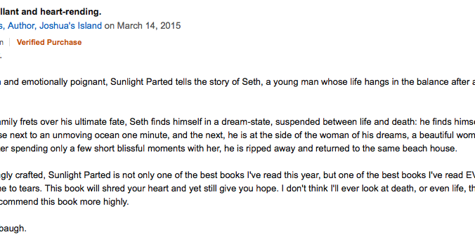 Mar172015WritingI received a very nice review today on Amazon from a stranger that I have never met. He heard about my book on GoodReads.com and bought the Kindle version. When I read his review I had to take a screenshot! Category: WritingBy seanredenbaughMarch 17, 2015 Author: seanredenbaugh Post navigationPreviousPrevious post:Typos & CorrectionsNextNext post:Danville Book World SigningRelated postsBlackmill ProgressDecember 15, 2017And so it begins…December 9, 2017Hot Off The PressJuly 20, 2017Evansville Book Signing Was a Success!April 25, 2017Book now for sale here!March 22, 2017First CaseMarch 20, 2017